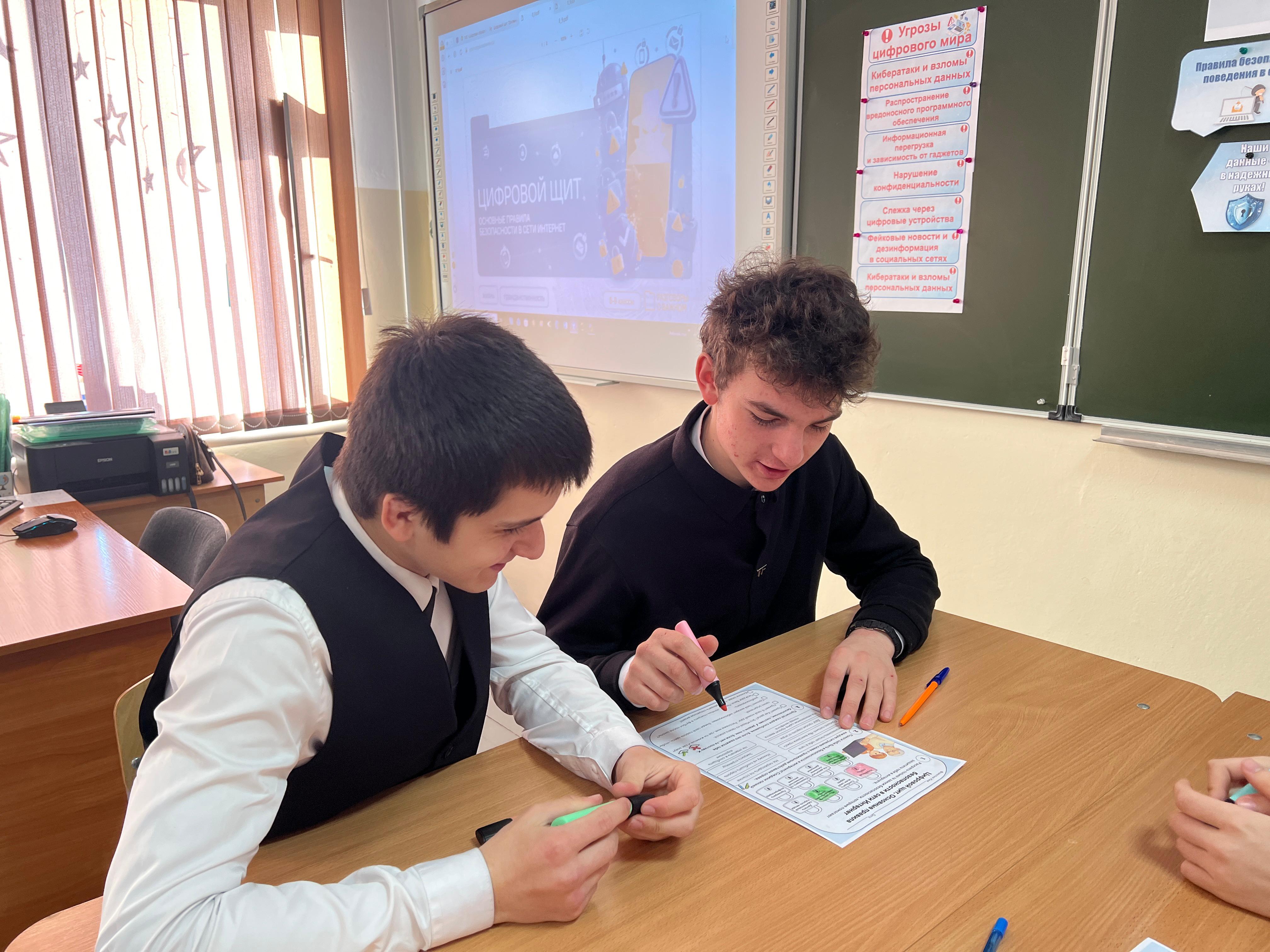 В 10–11-х классах учащимся рассказали о современных инструментах защиты информации и способах борьбы с утечкой данных. В рамках занятия также предусмотрели просмотр аналитического видеоматериала о киберугрозах и выполнение практического задания, в ходе которого нужно было разработать алгоритм действий при столкновении с интернет-угрозами.