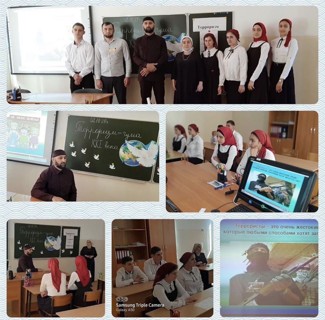 02.10.2020Во исполнение протокольного поручения Главы Чеченской Республики Р.А. Кадырова № 01-29 от 27.01.2015г, в МБОУ «Эникалинская СШ» проведена беседа на тему «Терроризм – чума 21 века», цель которой информационное противодействие терроризму, формированию активной гражданской позиции у всех категорий граждан, идеологическое противостояние терроризму и экстремизму. Просмотр презентации «Хроника террористических актов в России», был организован для учащихся 10 класса. После был обсужден просмотренный материал. В беседе принимал участие имам н.п. Умханов М.М. В своей речи он подчеркнул, что сегодня весь мир должен объединиться в борьбе с жестокостью и терроризмом. Ведь чужой беды не бывает, горе не имеет национальных и религиозных различий. Нужно помнить, что в наших собственных силах обезопасить себя и окружающих!