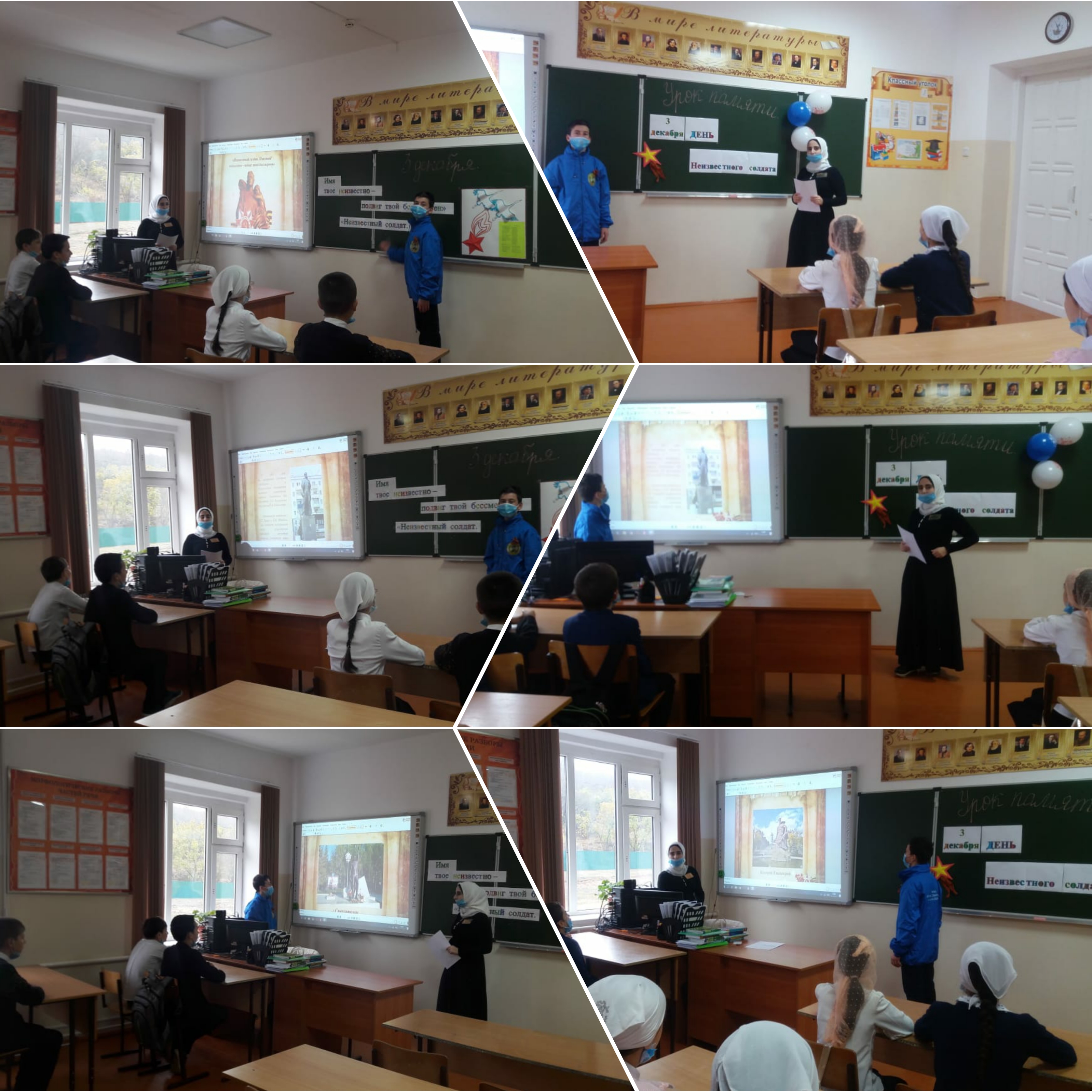 Учащиеся 5, 6, 7 классов совершили виртуальную экскурсию по местам памяти, где установлены памятники и мемориалы неизвестному солдату, братские могилы «Памятники вечной славы». В ходе проведения классных часов было рассказано об исторических событиях Второй Мировой войны. Учащиеся почтили память всех неизвестных солдат, защищавших Отечество, которые ценой своей жизни сберегли Родину.