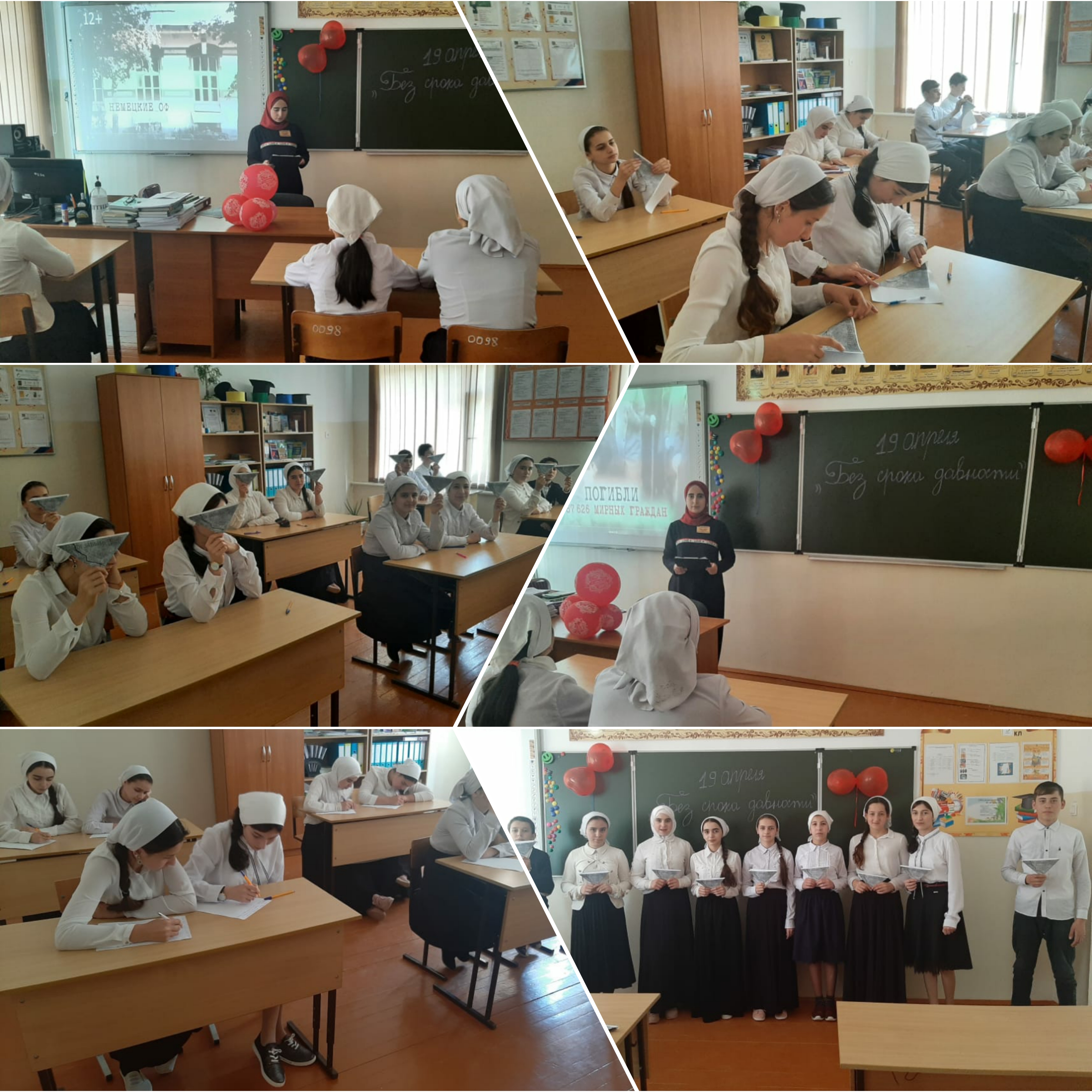 19.04.202119.04.2021 г. года в 8 классе МБОУ «Эникалинская СШ» прошел урок мужества «Без срока давности», посвященный памяти жертв геноцида советского народа немецко-фашистскими захватчиками в годы Великой Отечественной войны, с просмотром видеофильма «Без срока давности» и написание Письма в будущее «Нельзя забыть» - послания самому себе и своим потомкам в форме треугольного (военного) письма, в котором выражается личное восприятие и позиции обучающихся о преступлениях нацистов в отношении мирного советского населения.