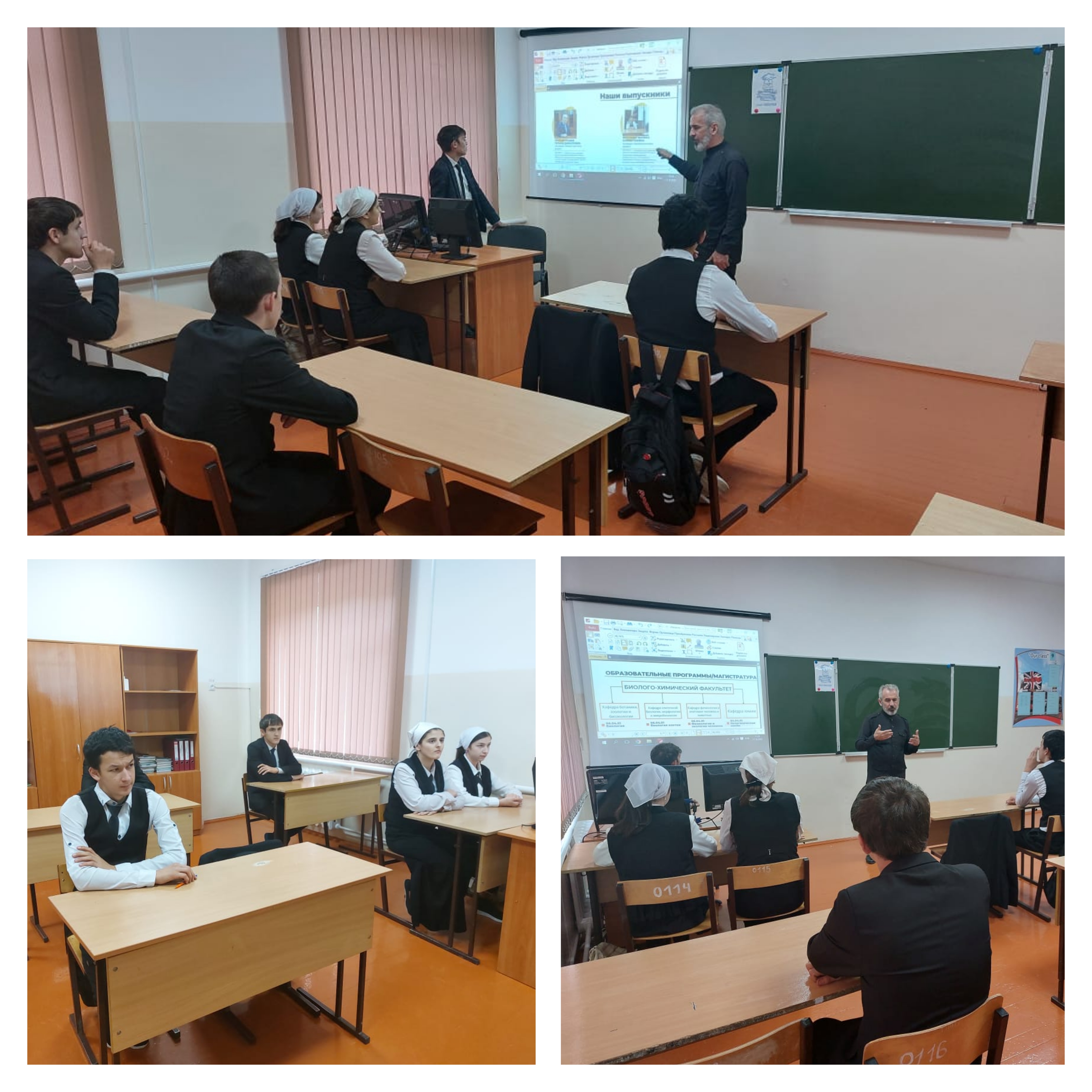 Гилани Дикалуевич представил презентацию «ЧГУ им. А.А.Кадырова. Биолого-химический факультет», из которой учащиеся узнали по каким специальностям готовят на кафедре, формах и сроках обучения, возможностях трудоустройства, о вступительных экзаменах. Солтамурадов Гилани рассказал о выездных занятиях студентов по изучению флоры и фауны, разновидностях и структурах почв Чеченской Республики, о работах в современно оснащенных лабораториях, и еще много-много интересного из жизни студентов университета.