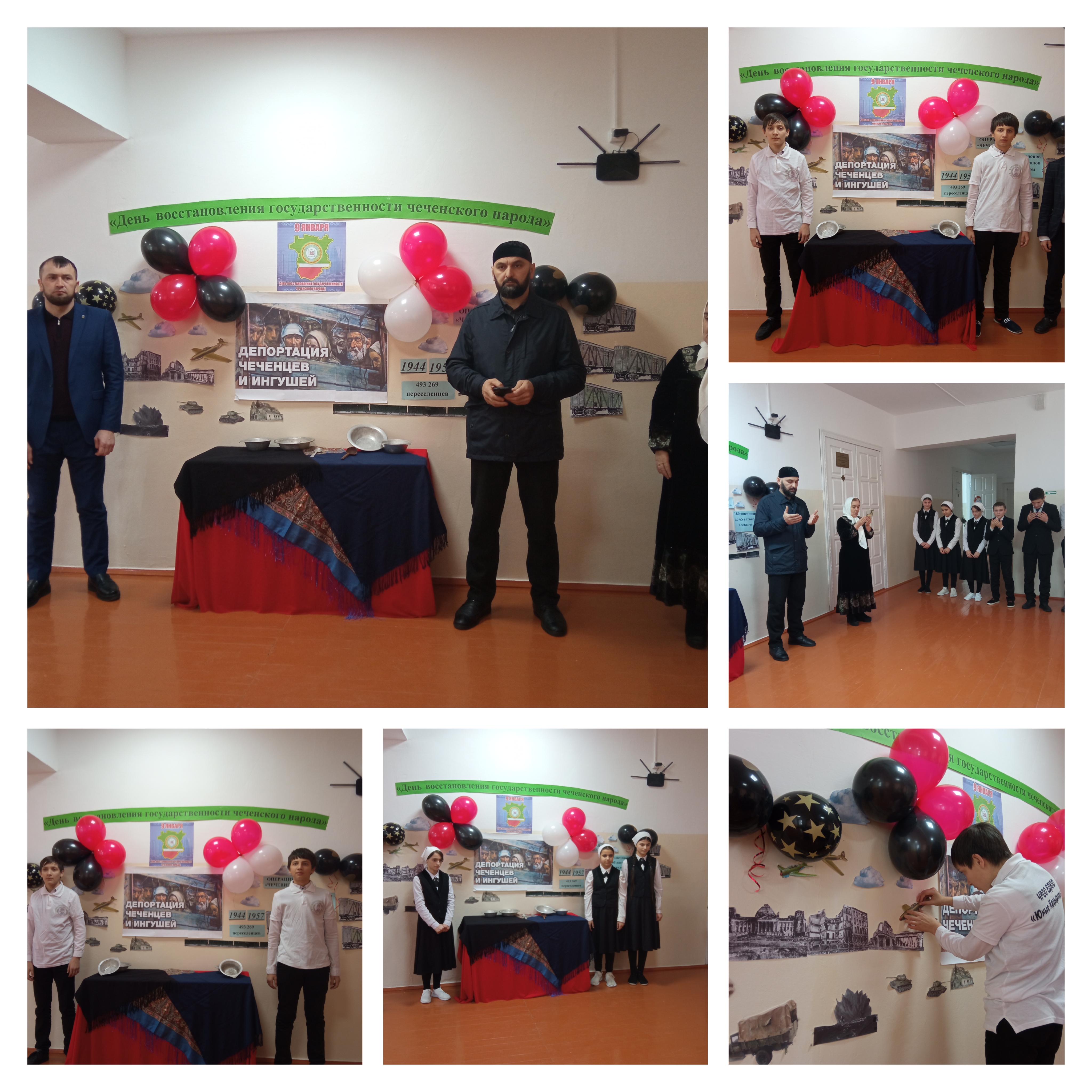 В ходе подготовки к линейке, активисты движения «Юные Кадыровцы» оформили настенную экспозицию (ярко-красочное наглядное оформление), передающую события 23 февраля 1944 года.