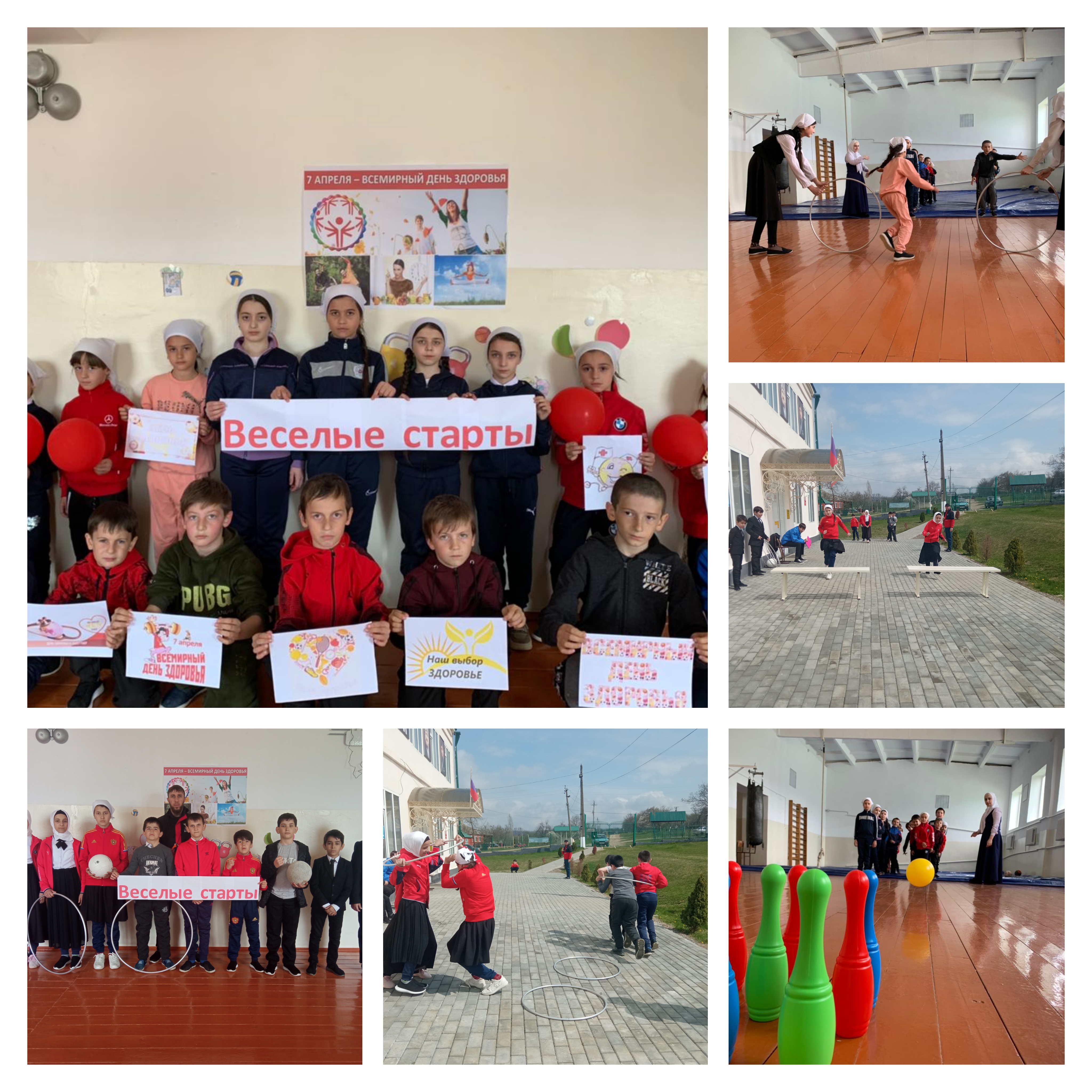 Сборные команды 1-4 классов «Спортсмены» и «Орлята» вышли на стартовую линию. Этиева Иман Денилхаевна дала инструктаж по соблюдению правил поведения в играх, озвучила программу мероприятий. Роль судьи выполняла Умарова Жамиля Магамедовна. Программа «Веселых стартов» состояла из игр: шар в кольцо, пройди препятствие, передай мяч.
