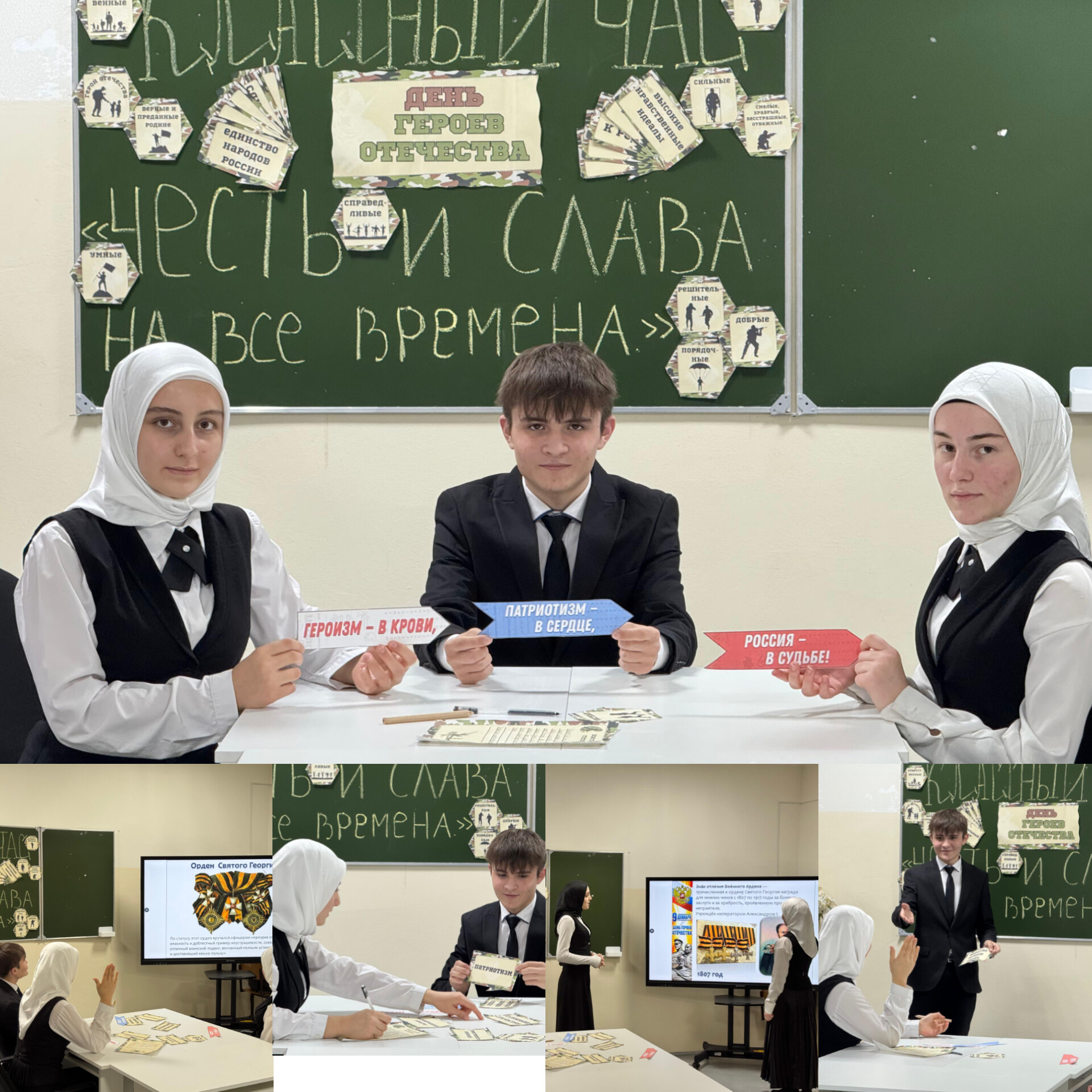Классный руководитель рассказывала о ключевых героях Отечества — от Александра Невского до современных защитников, показывая фото и видео. Дети работали в группах: анализировали подвиги, создавали плакаты и обсуждали, как честь и слава вдохновляют сегодня.