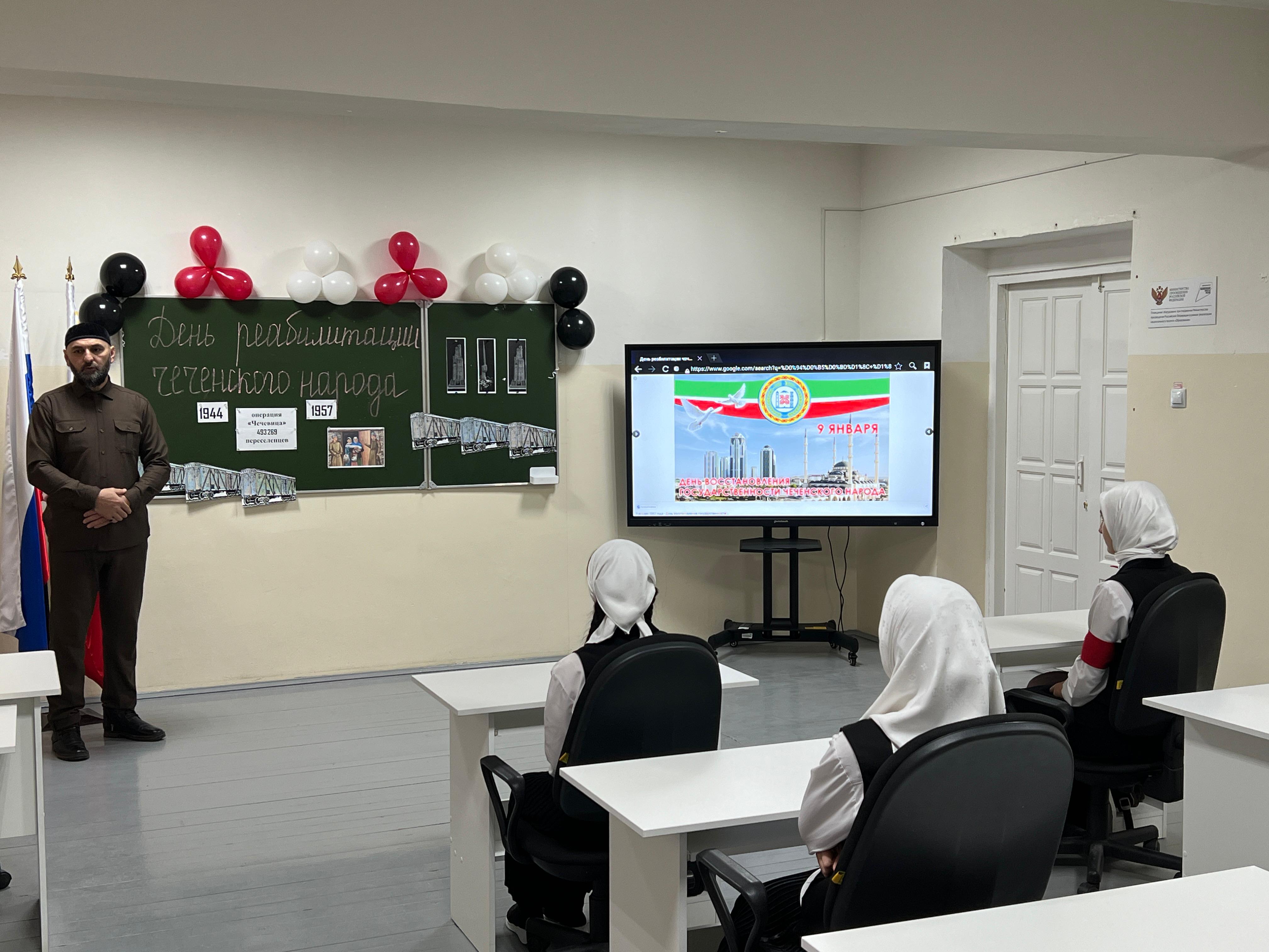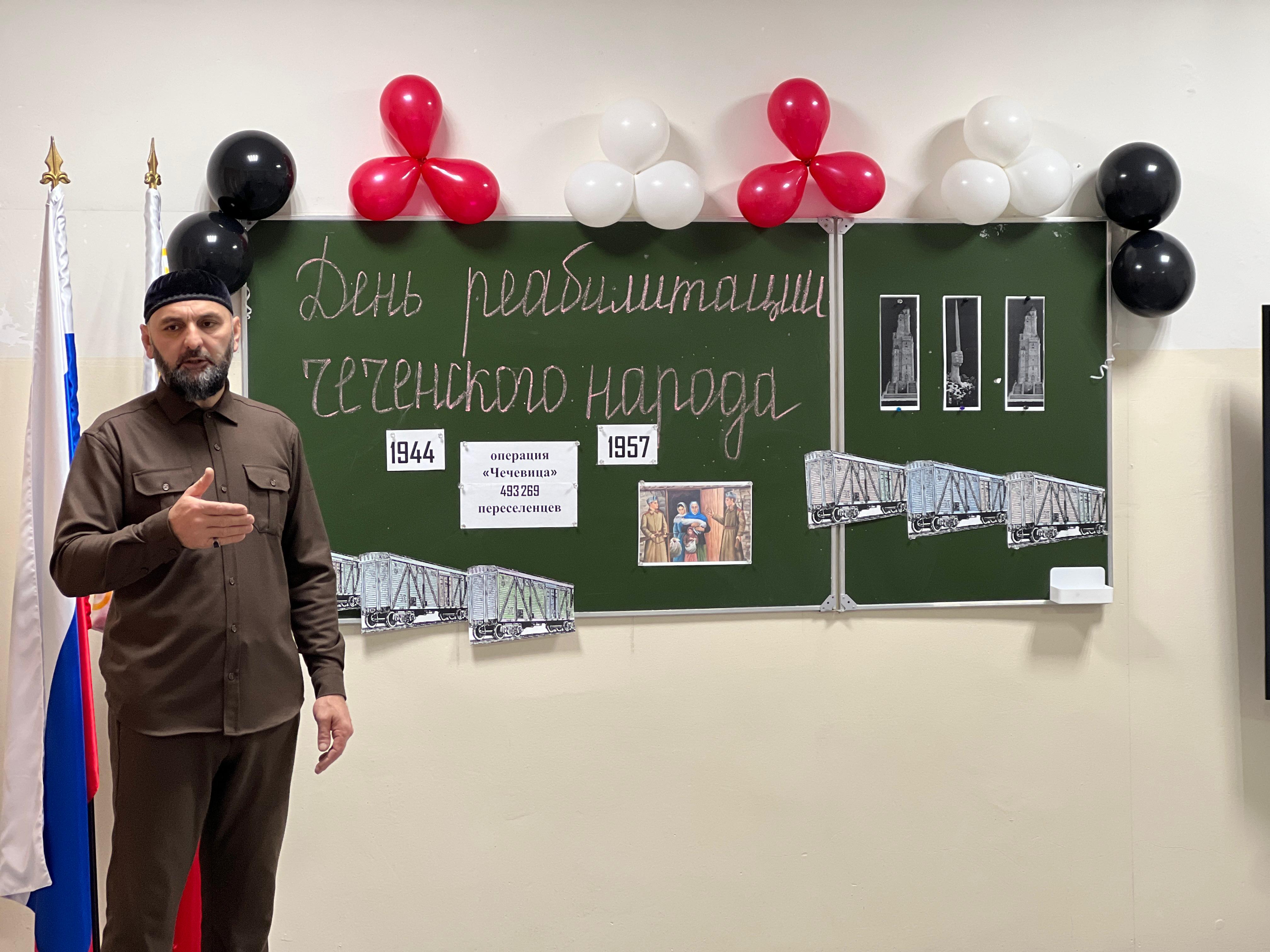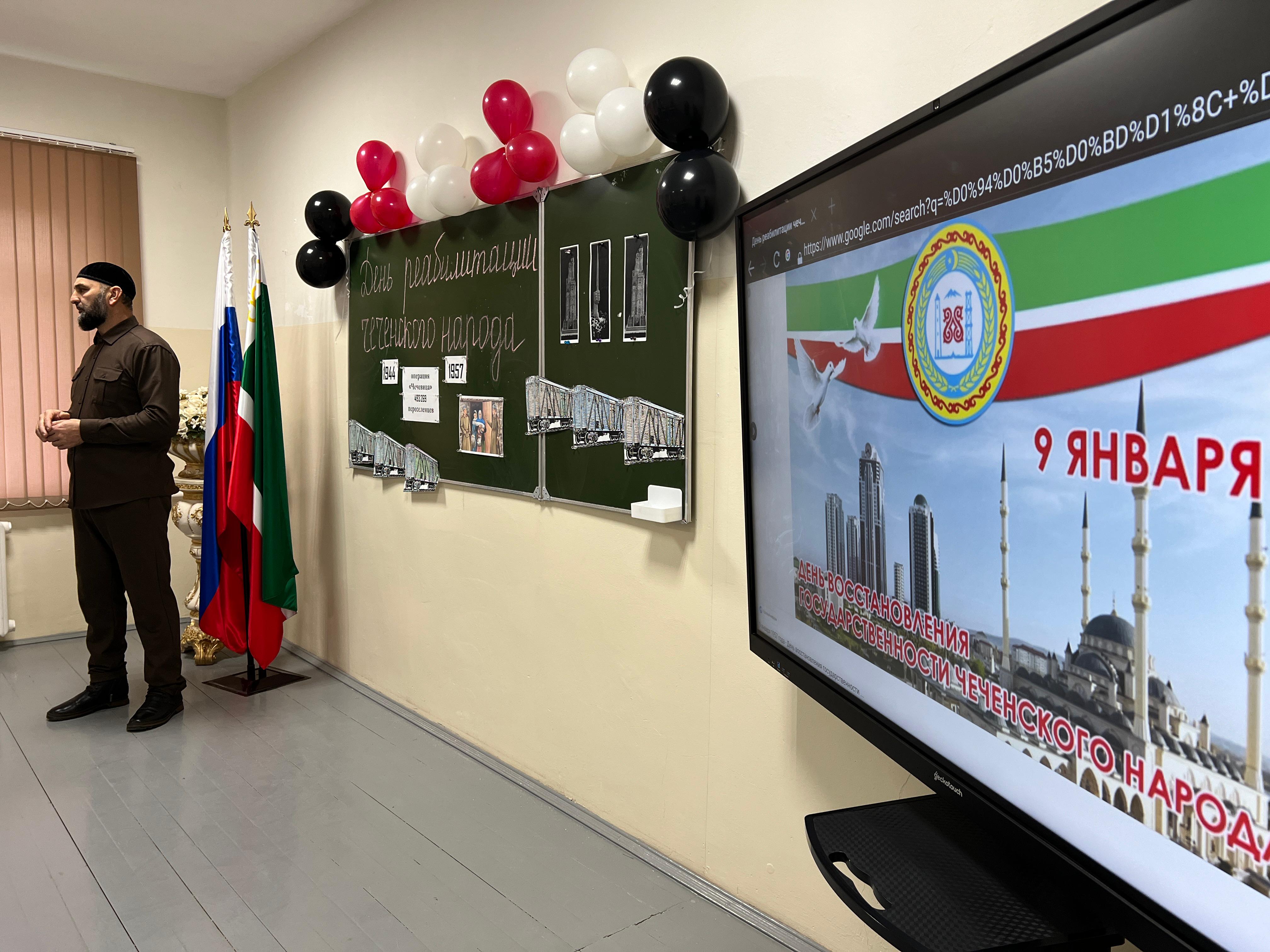 После исполнения гимнов Российской Федерации и Чеченской Республики выступила заместитель директор по воспитательной работе Сайдал-Алиева Р.Б. В своем вступительном слове Роза Бекмагамедовна отметила, что в 1957 году был издан Указ Президиума Верховного Совета РСФСР, предусматривающий снятие запрета на возвращение чеченцев и ингушей в места постоянного проживания, которые были депортированы 23 февраля 1944 года. Благодаря усилиям Юнуса Дешериева, Халида Ошаева и многих других именитых личностей среди чеченцев, удалось достигнуть некие успехи в этом деле. И 9 января 1957 года чеченцам разрешили вернуться в родные края. День восстановления государственности Чеченского народа, имеет особое историческое значение для всех чеченцев. Это событие дало возможность вайнахам вернуться на свою историческую Родину.