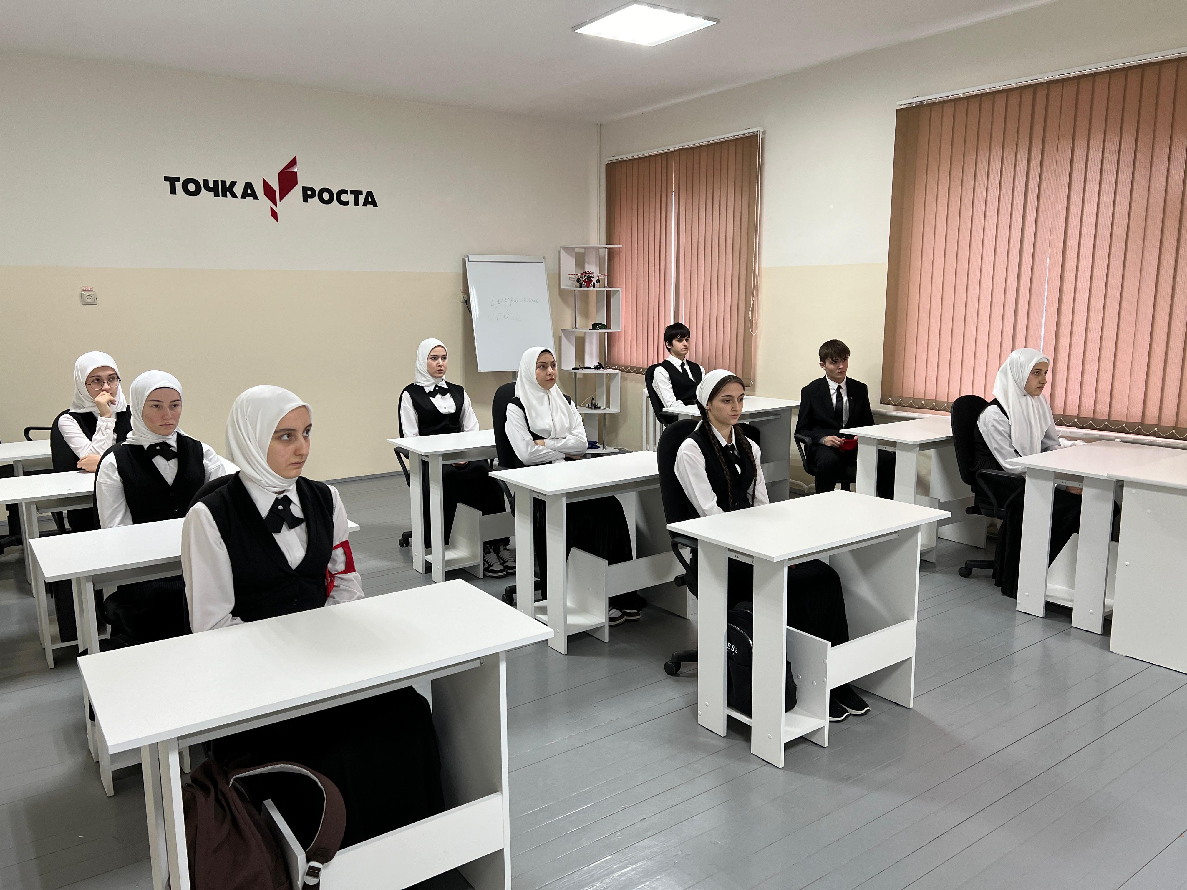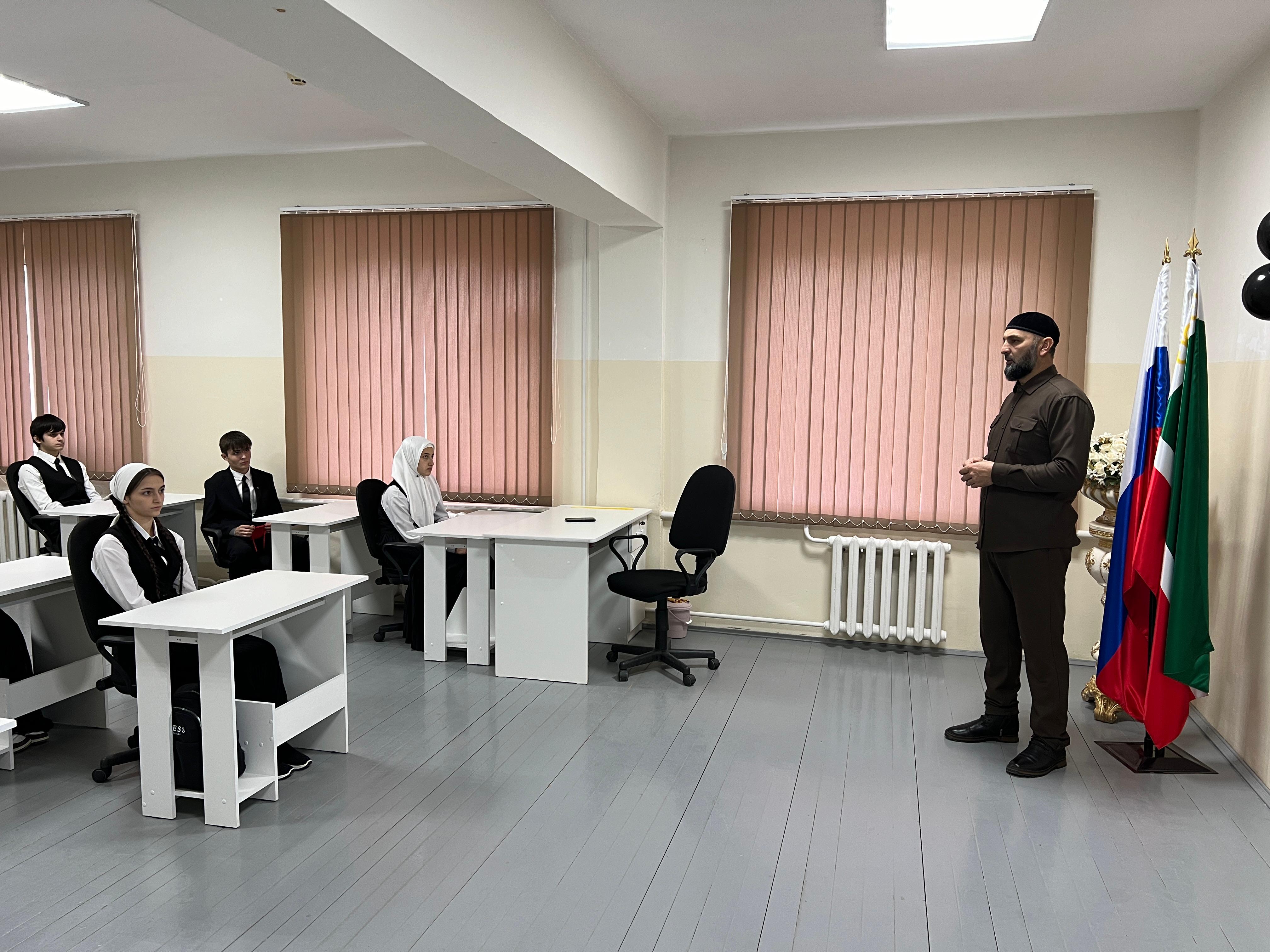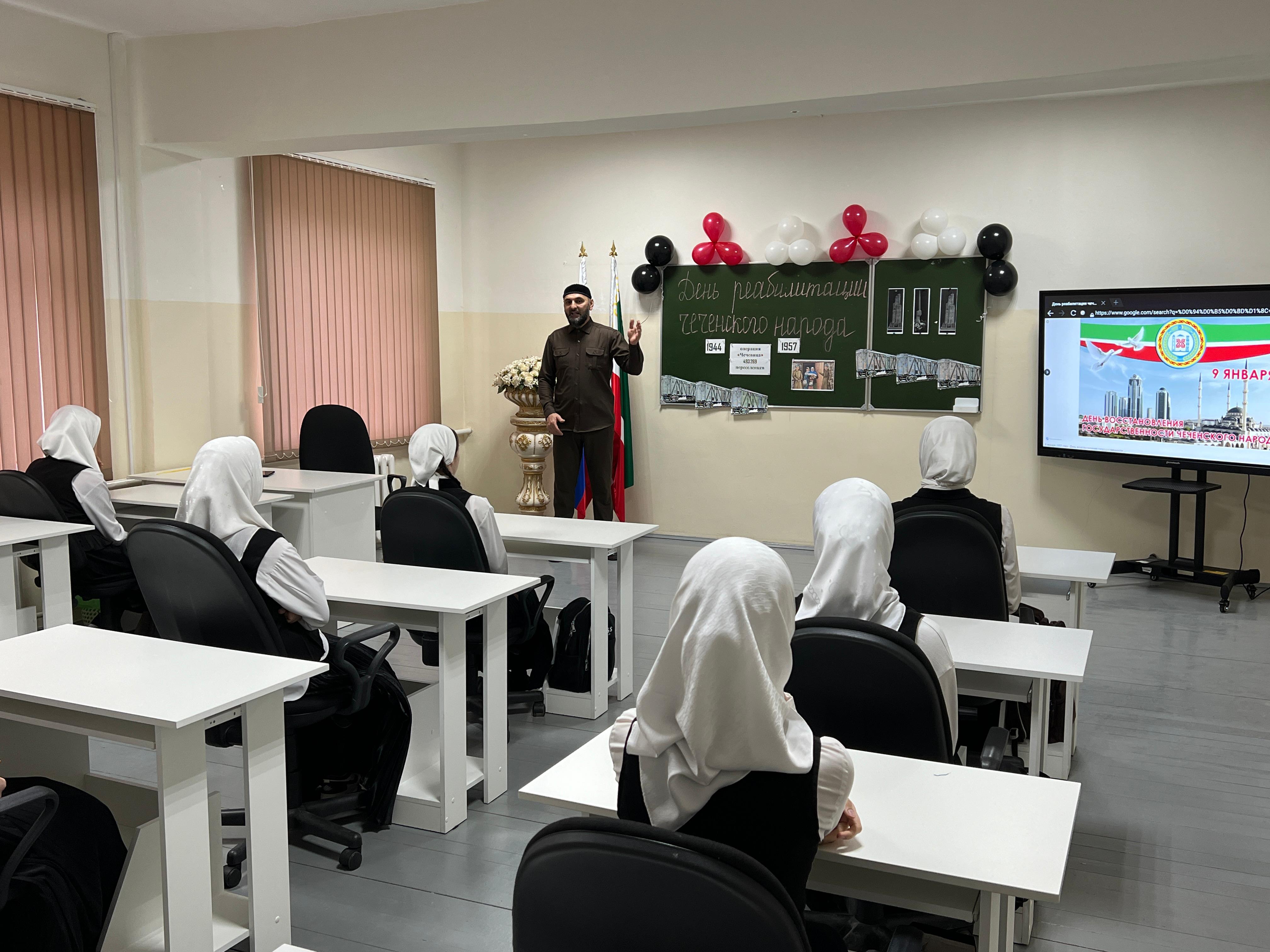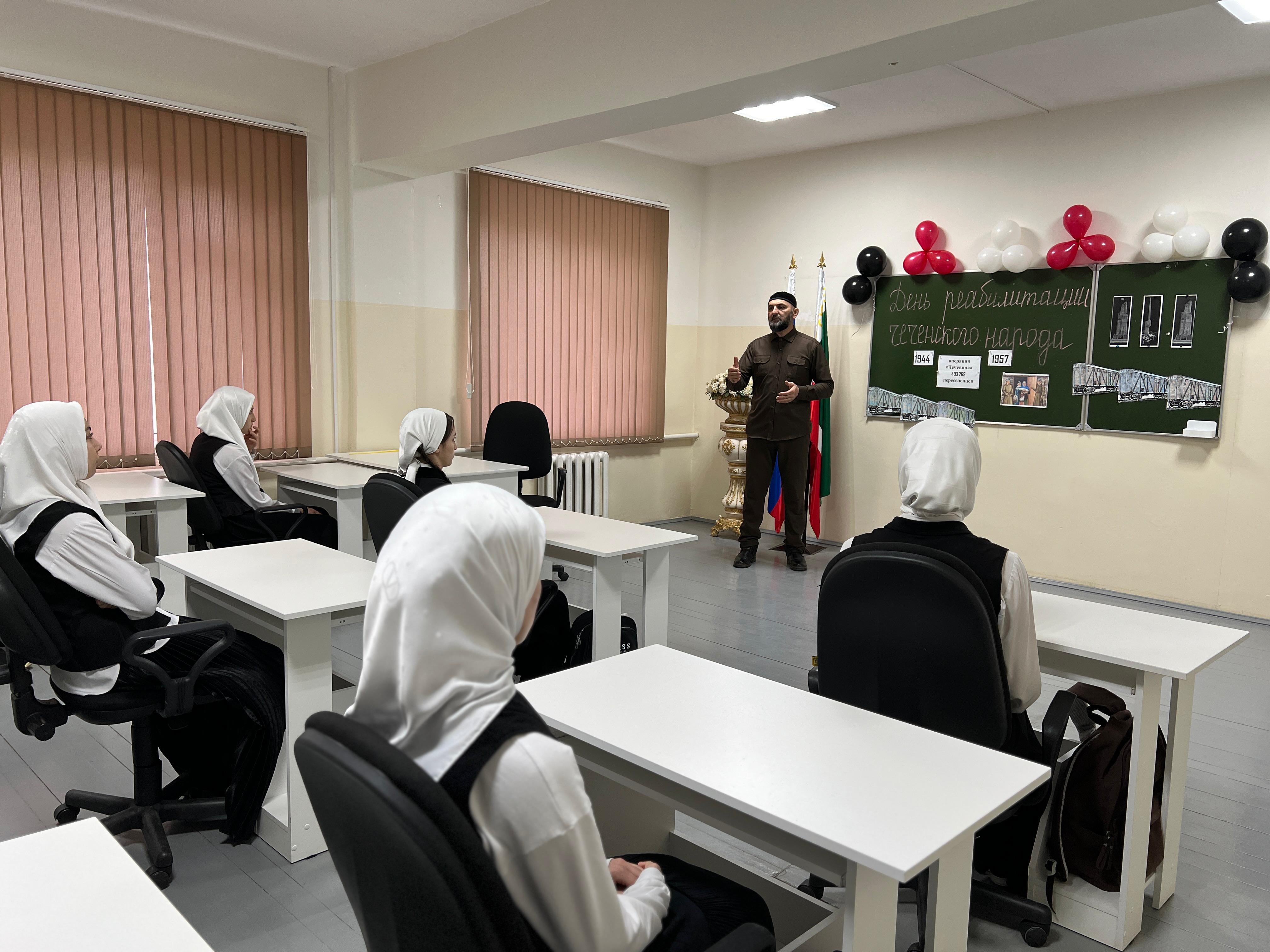 После исполнения гимнов Российской Федерации и Чеченской Республики выступила заместитель директор по воспитательной работе Сайдал-Алиева Р.Б. В своем вступительном слове Роза Бекмагамедовна отметила, что в 1957 году был издан Указ Президиума Верховного Совета РСФСР, предусматривающий снятие запрета на возвращение чеченцев и ингушей в места постоянного проживания, которые были депортированы 23 февраля 1944 года. Благодаря усилиям Юнуса Дешериева, Халида Ошаева и многих других именитых личностей среди чеченцев, удалось достигнуть некие успехи в этом деле. И 9 января 1957 года чеченцам разрешили вернуться в родные края. День восстановления государственности Чеченского народа, имеет особое историческое значение для всех чеченцев. Это событие дало возможность вайнахам вернуться на свою историческую Родину.