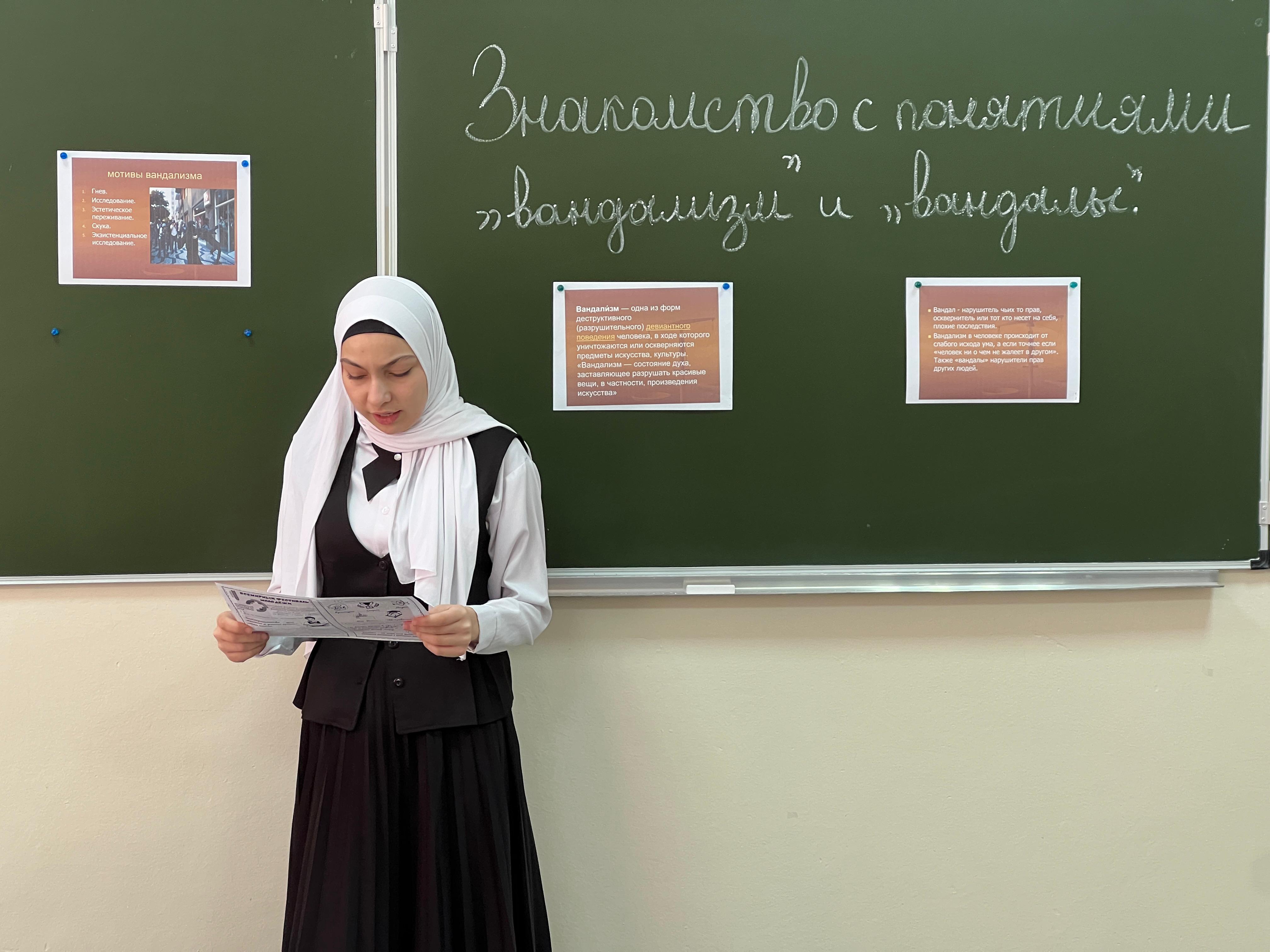 Затем детям рассказали, что вандализм — это одна из форм разрушительного поведения человека, бессмысленное уничтожение культурных и материальных ценностей. Вандалы, в свою очередь, — люди, которые разрушают для достижения каких-либо целей.