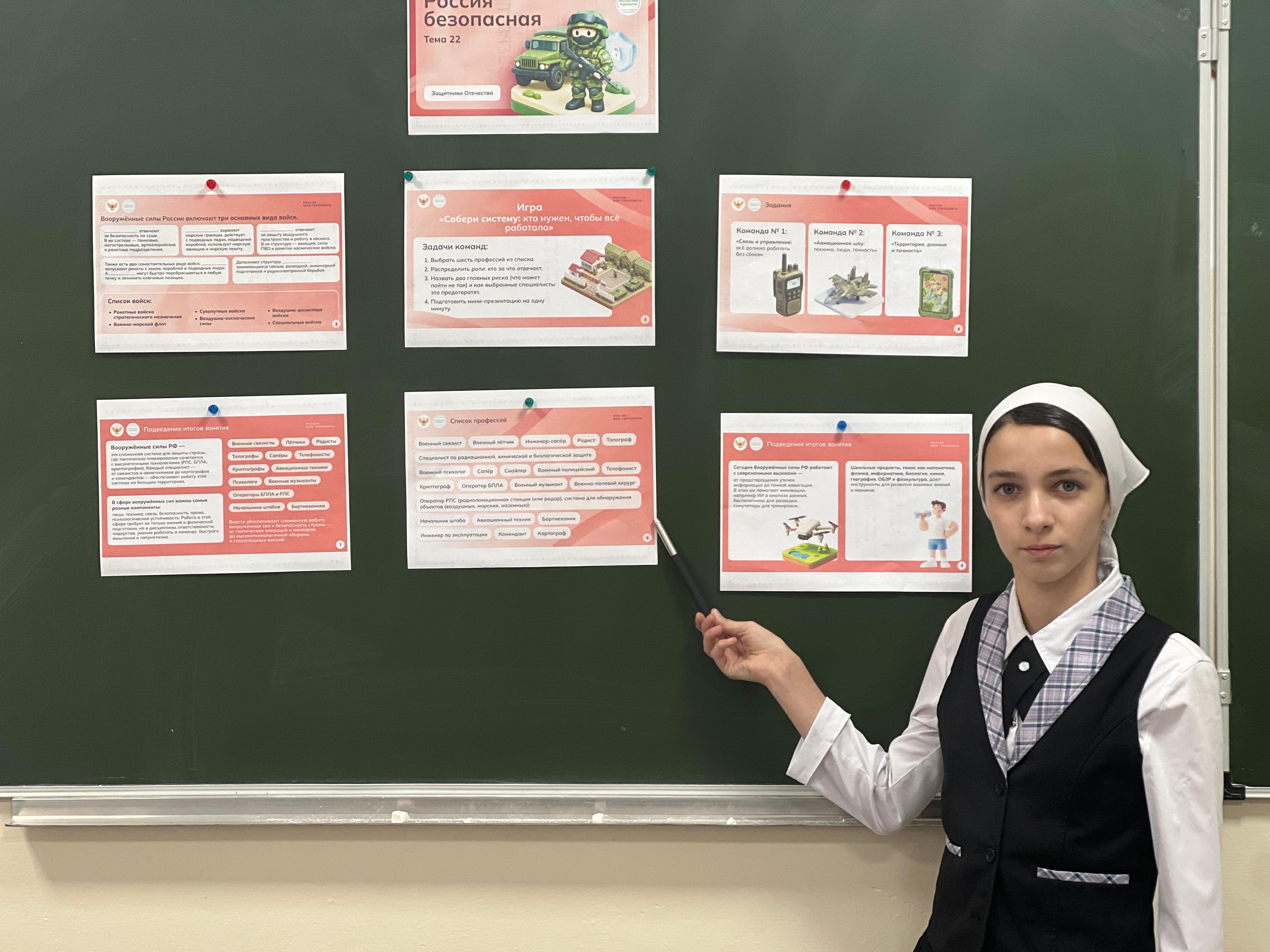 Кульминацией урока стало выполнение интерактивного задания. Работая в группах, ученики не только проверили свои знания об устройстве армии, но и наглядно увидели, как сложно и многогранно устроена система обороны нашей страны. Такая форма работы помогла школьникам понять: безопасность России — это результат труда тысяч специалистов разных профессий, и за каждым направлением стоит свой уникальный путь развития.