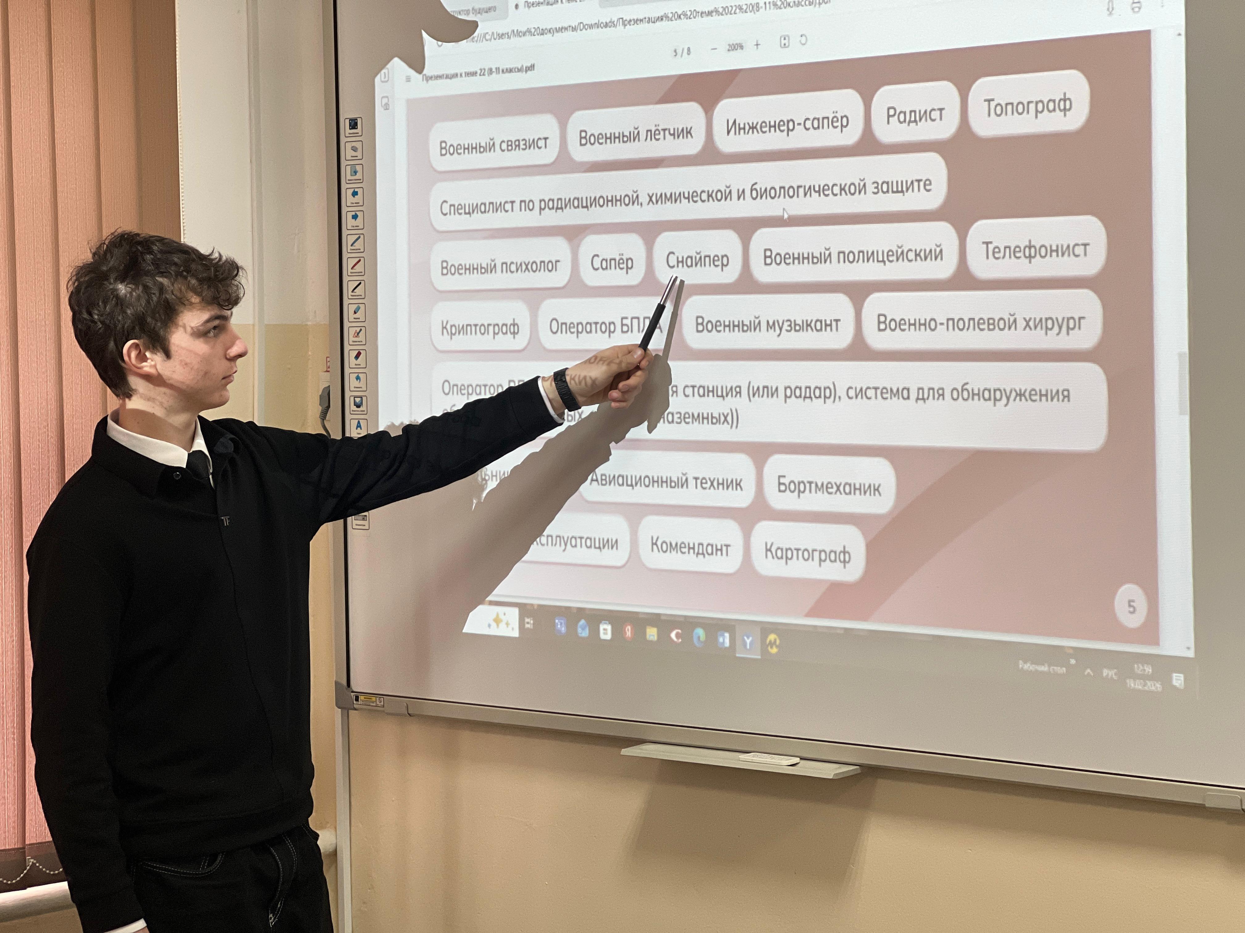 19.02.202619 февраля в нашей школе продолжился цикл занятий профориентационного курса «Россия — мои горизонты». Очередная встреча была посвящена важной и многогранной теме : «Россия безопасная. Защитники Отечества».